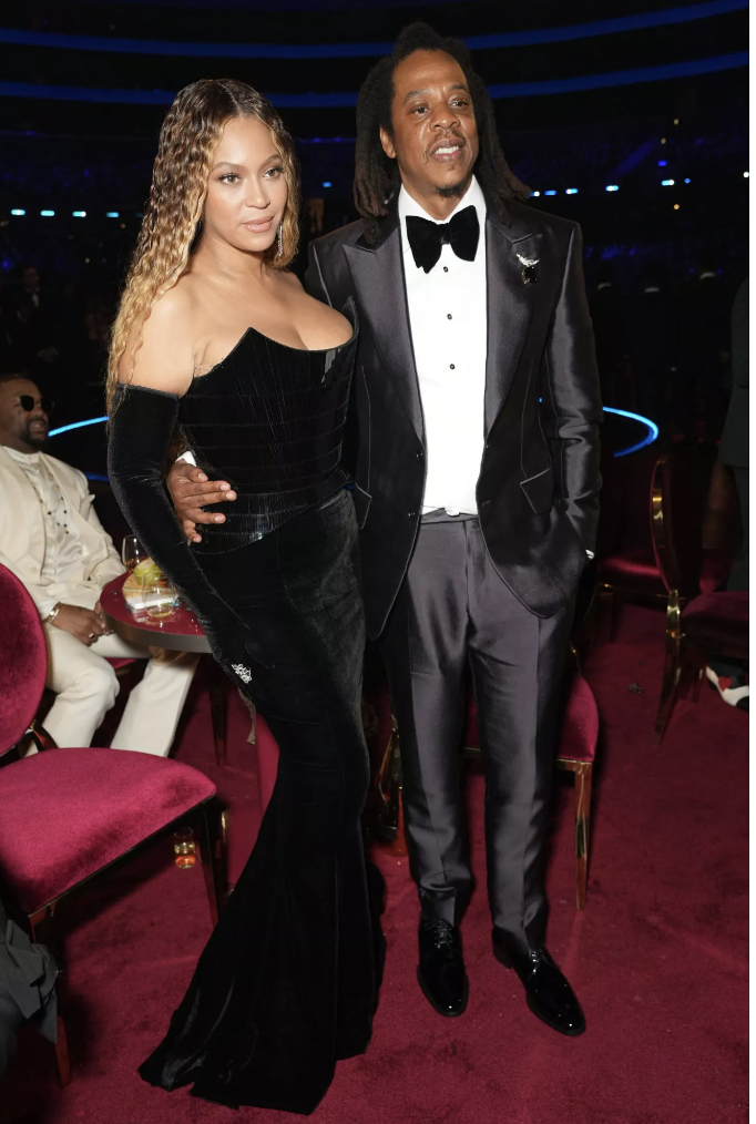 Beyonce and Jay-Z wore black to win the gold. She showed in a black velvet Schiaparelli dress. While Jay-Z wore a Tiffany and Co tuxedo.